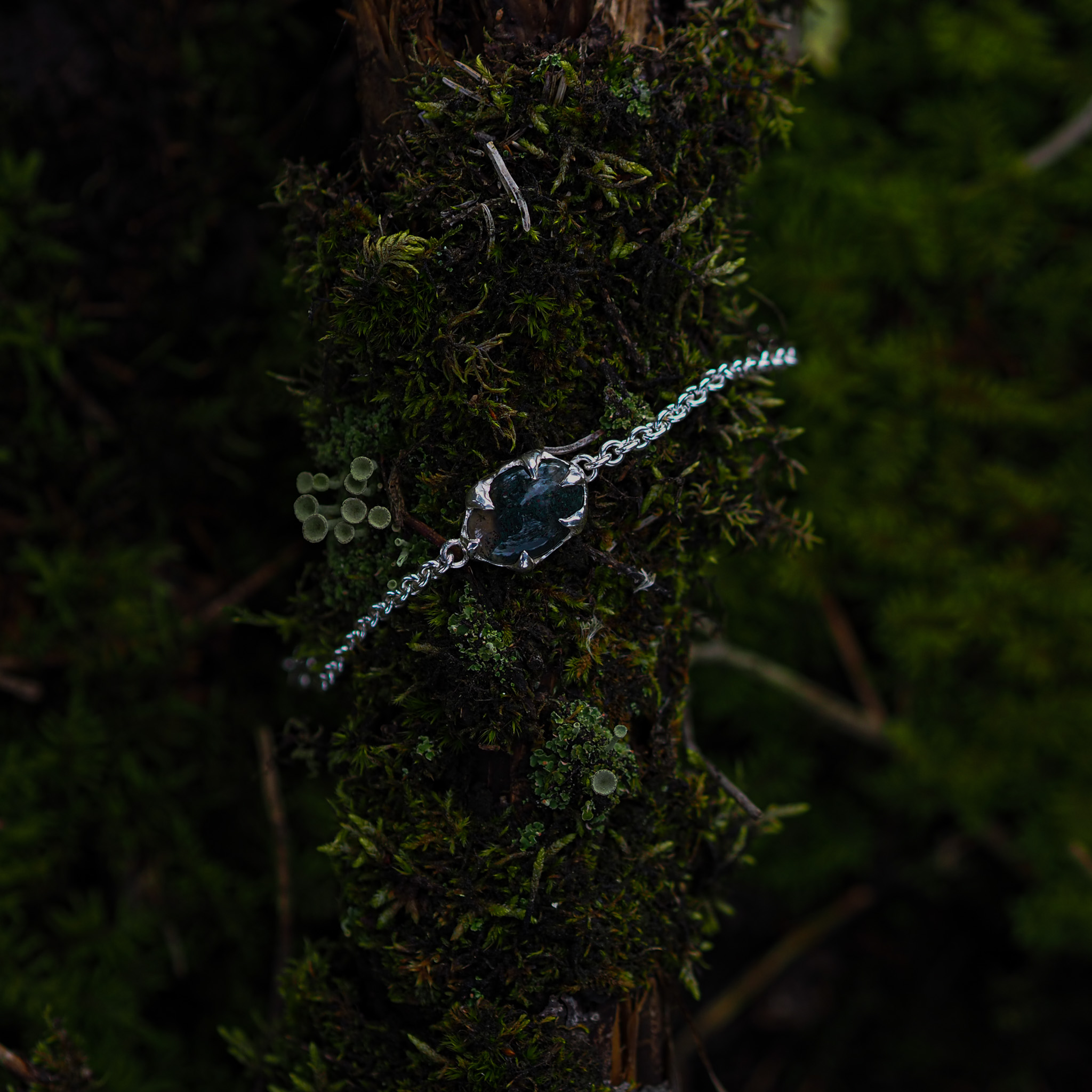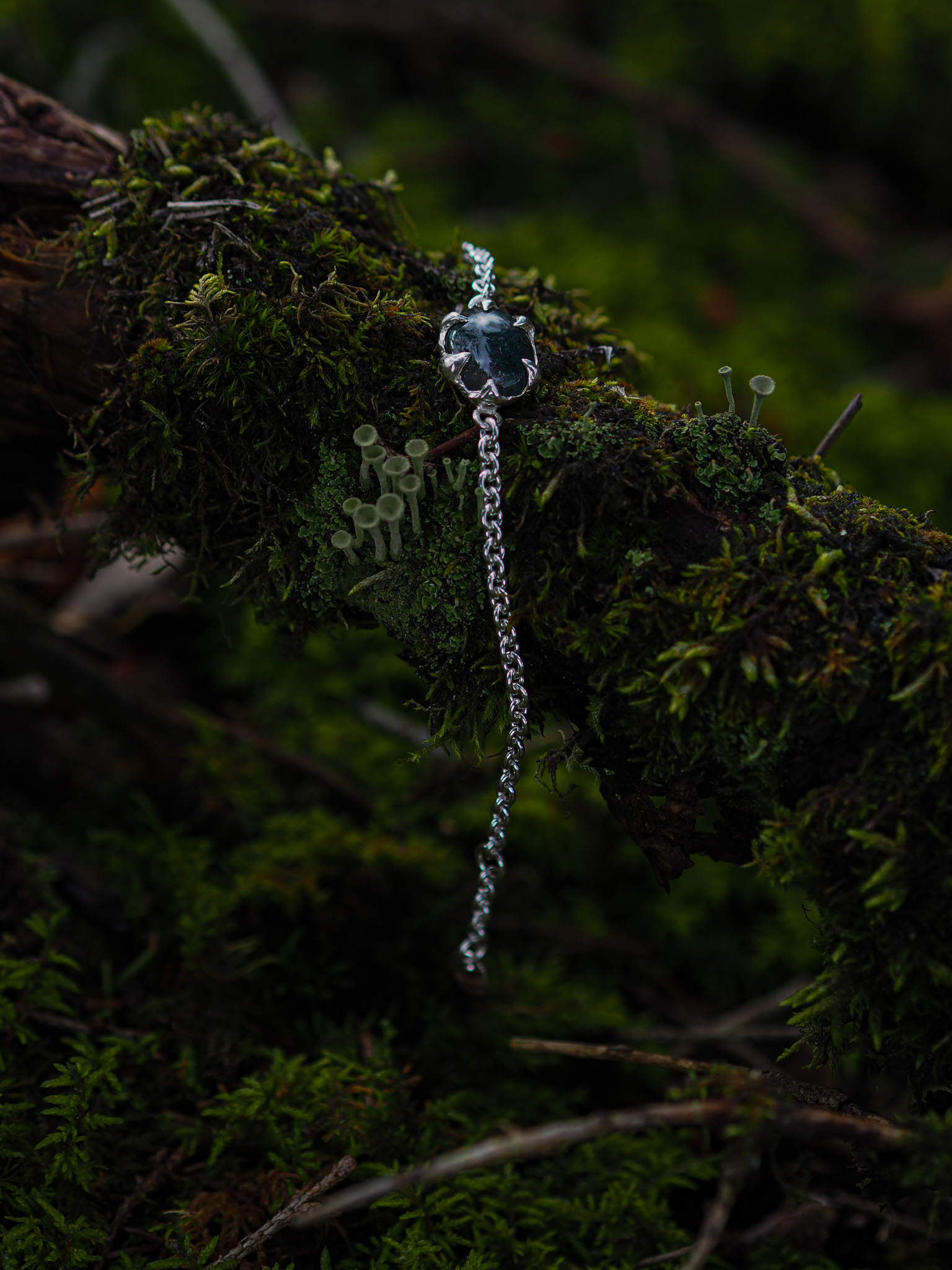 Hopeisten kynsien keskellä lepää sammalakaatti — maanläheinen kivi, joka antaa korulle metsän sävyjä ilman koreilua.